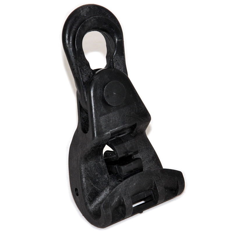 Установка зажима производится на кронштейны с диаметром крюка до 16 мм без применения инструментов. Зажим изготовлен из пластмассы, армированной стекловолокном.