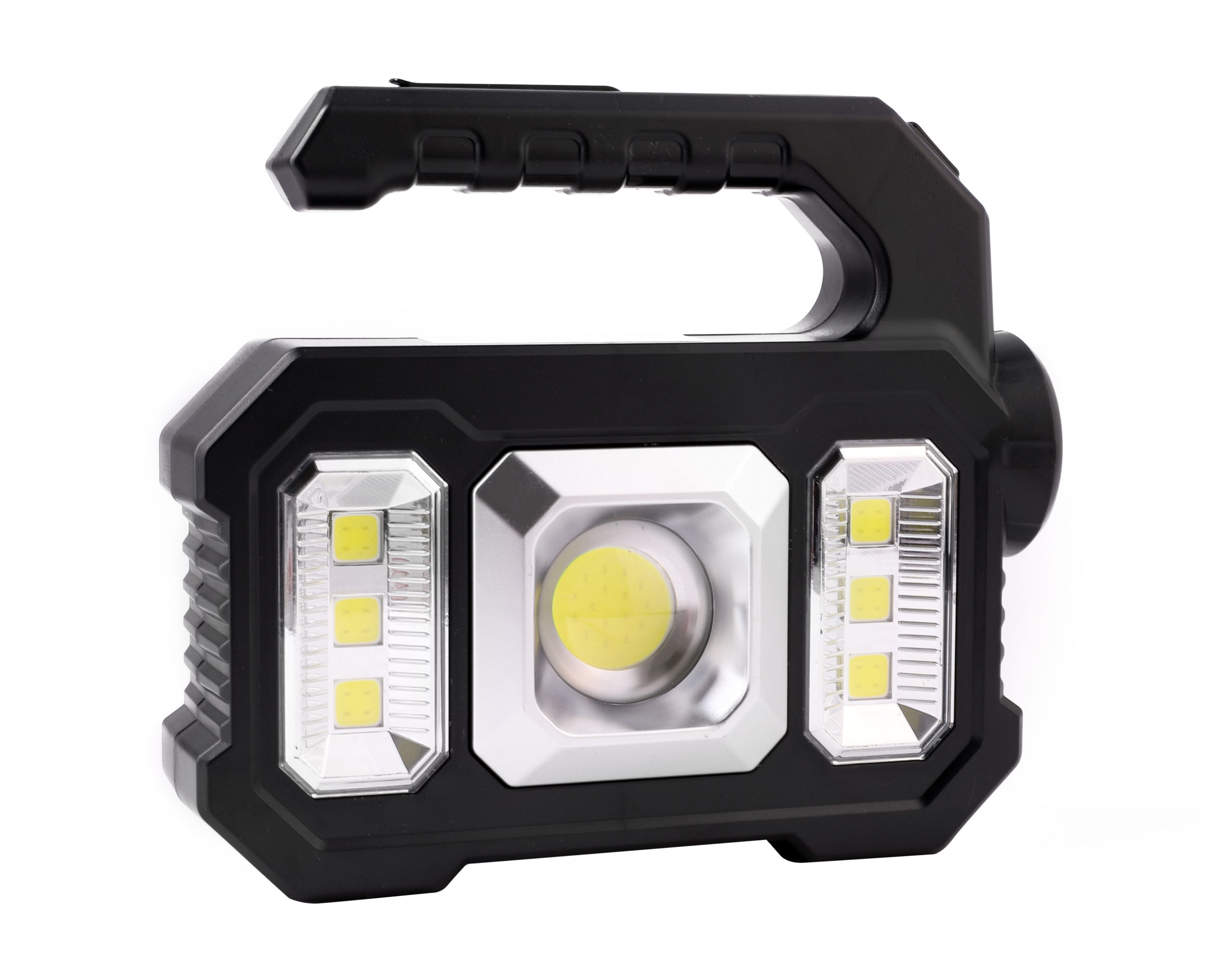 Фонарь с/диодный аккумуляторный с боковой COB–подсветкой, солнечной батареей и доп электропитанием от 4AAA батареек. Цвет корпуса: черный. Работает от встроенного аккумулятора Li-Ion типа 18650 (возможен вариант работы от батареек 4xAA, причем если установлены батарейки, то сначала расходуется энергия батареек). Материал корпуса–пластик. Источники света–точечный передний светодиод (цв. температура 6000К, макс. св. поток 160Лм); COB (цв. температура 3000К, макс. св. поток 120Лм); 6хSMD (цв. температура 3000К, макс. св. поток 60Лм). Максимальная потребляемая мощностью 2Вт. Дистанция освещения – до 30м. 3 режима работы: COB/6xSMD/передний LED. Выключатель–трехпозиционная кнопка. Время работы при полностью заряженном аккумуляторе: до 4ч. Время заряда аккумулятора (примерное) – 4ч (зависит от тока зарядного устройства). Заряд через порт Micro USB при помощи распространенных зарядных устройств для телефонов. Возможность заряда через встроенную солнечную батарею, Возможность использования фонаря в качестве PowerBank для небольшой поддержки заряда мобильных устройств. Встроенный складывающийся крючок для подвешивания.