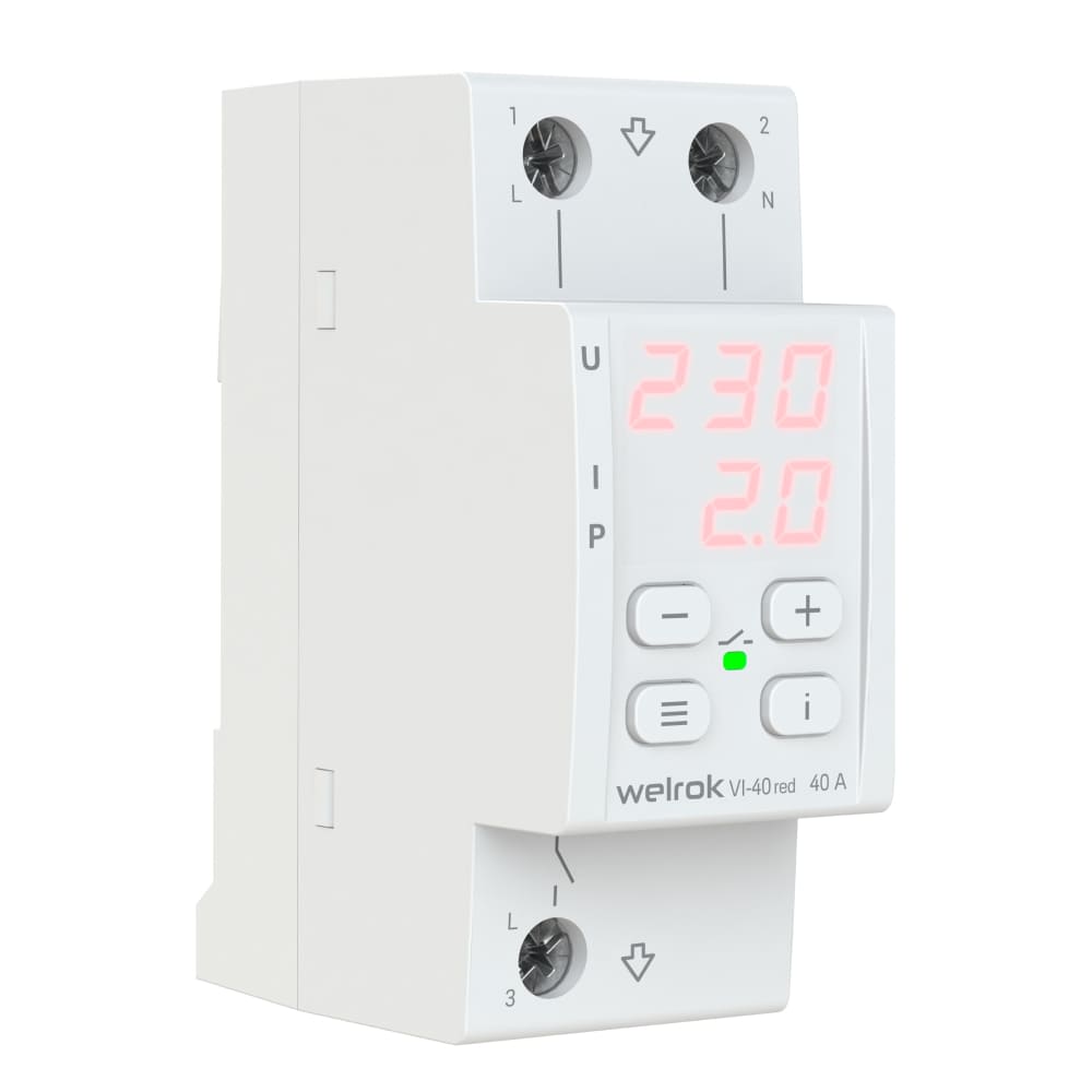 Реле напряжения с контролем тока Welrok VI red защищает оборудование от скачков и провалов напряжения, последствий обрыва нулевого провода и превышения тока или мощности. Реле отключает нагрузку, если напряжение, ток или мощность выходит за установленные пределы. Нагрузка включается автоматически, когда напряжение вернется в установленный диапазон и истечет время задержки.